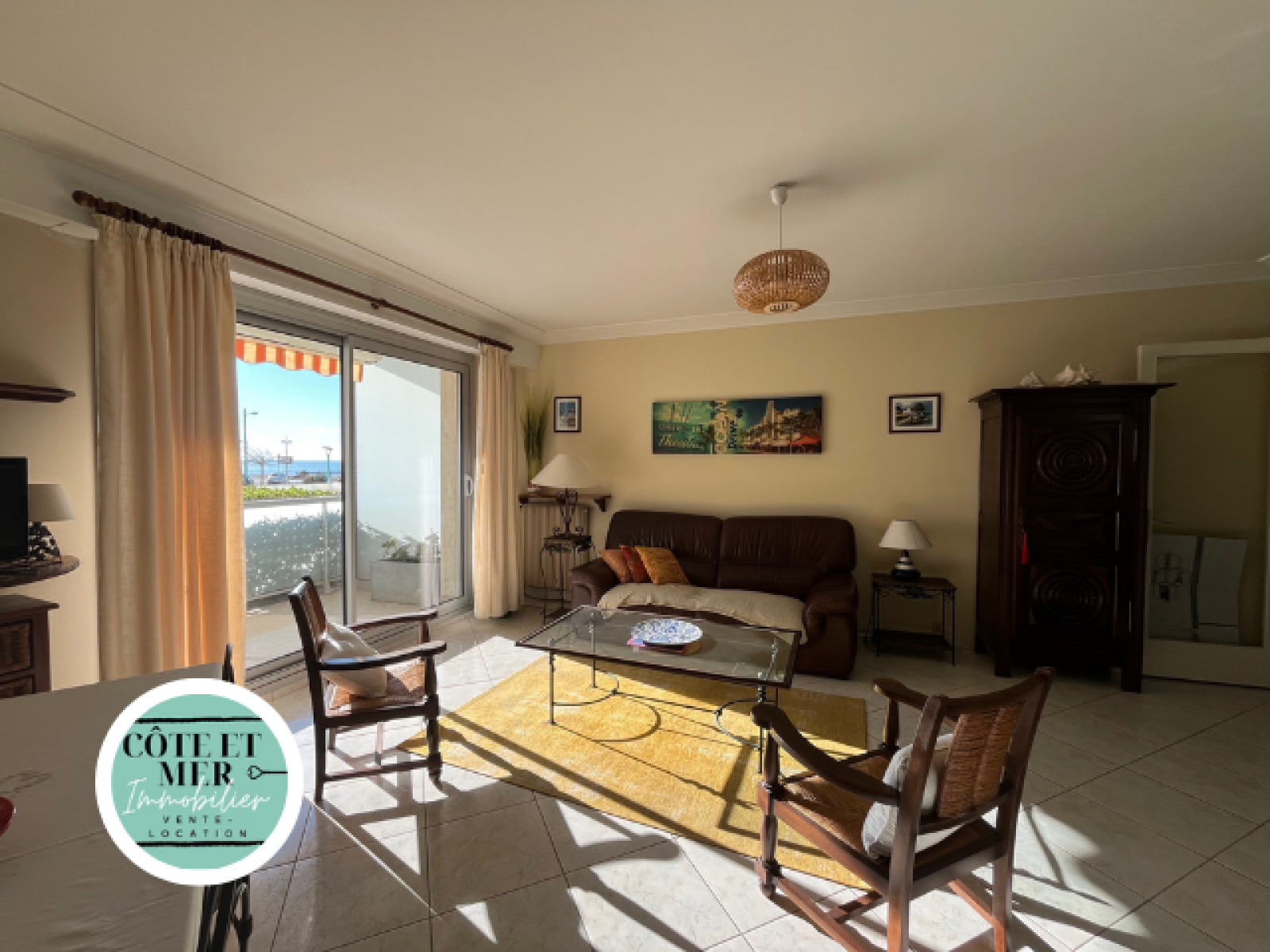 L'agence Côte et Mer vous présente : Dans une résidence de standing en bord de mer dans le quartier des Demoiselles, venez passer d'agréables moments dans cet appartement lumineux. Situé en rez de chaussée surélevé il vous offre une entrée desservant une cuisine équipée et aménagée, un grand séjour salon donnant sur un balcon avec vue mer. Deux belles chambres, une salle d'eau et un wc séparé viennent compléter l'ensemble. Parking privatif et cave.
